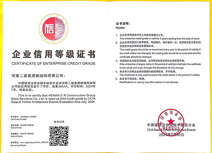 我公司参编《全国钢木建筑行业优秀工法精选》并荣获2023年度建筑业AAA级信用企业(钢木企业),彰显了我公司坚定不移走技术创新的发展道路,在技术创新、企业信用体系建设方面取得了显著成效,也标志着公司钢构品牌社会知名度的进一步提升。公司将继续秉持创新精神,深化市场布局,为行业持续进步与社会繁荣发展贡献更多力量。