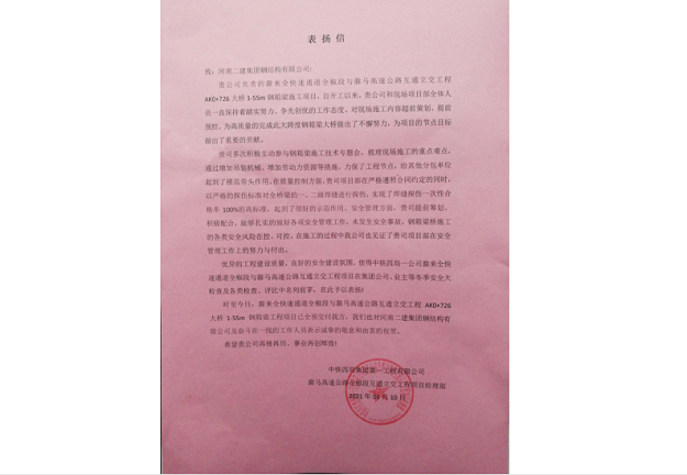 中铁四局集团第一工程有限公司向完美·体育发来表扬信