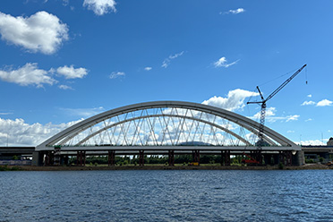 哈萨克斯坦阿斯塔纳市轻轨一期伊希姆河钢拱桥项目该拱桥位于哈萨克斯坦总统府旁,桥长155m,为下承式简支系杆拱,主拱矢高2m,拱肋和主梁均采用钢结构,拱肋采用钢箱拱,主梁为钢结构纵横梁体系。